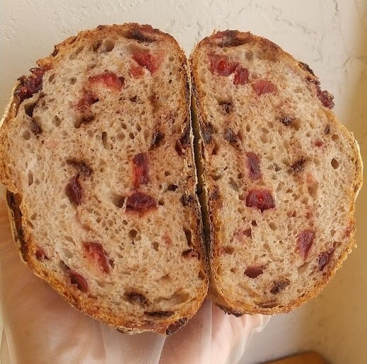 サワードゥカンパーニュ生地に、有機クランベリーとチョコチップを入れたおやつカンパーニュです。コーヒー、紅茶と共にお楽しみ下さい。